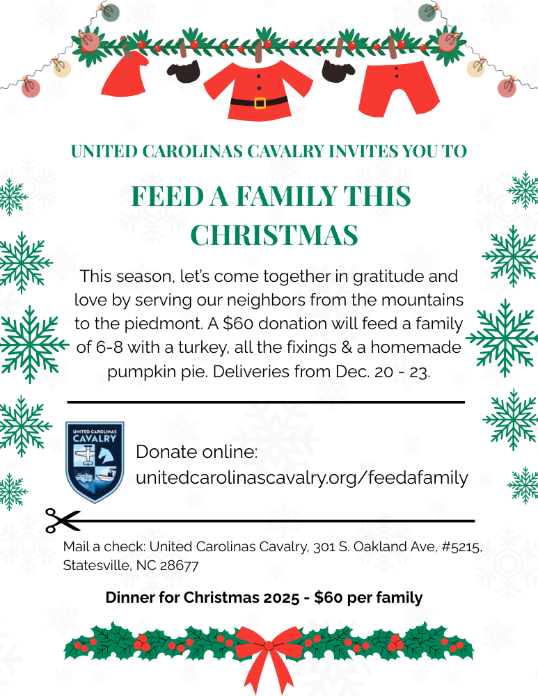 United Carolinas Cavalry is a 501(c)(3) tax-exempt charity. Our EIN is 33-1433609. All contributions designated for specific causes will be applied to those projects, and we may assess up to 15 percent to be used for administering the gift. Occasionally, we receive more contributions for a given project than can be wisely applied to that project. When that happens, we use these funds to meet a similar pressing need.